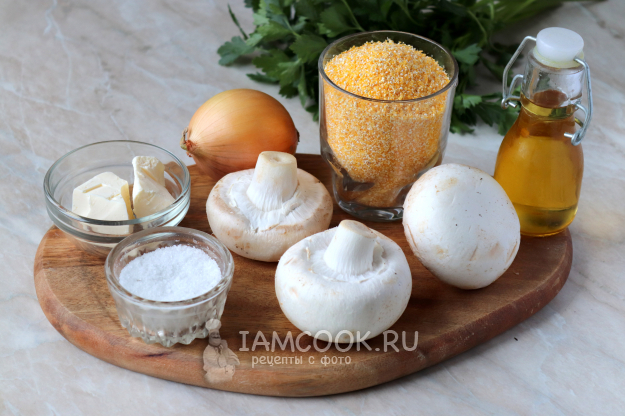 Возьмите все продукты для приготовления кукурузной каши с грибами (шампиньонами).