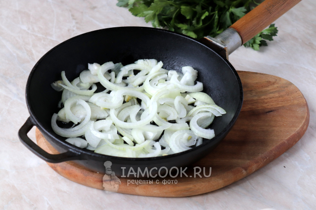 Лук нарежьте полукольцами и обжарьте на растительном масле до прозрачности, периодически помешивая, чтобы не подгорел.