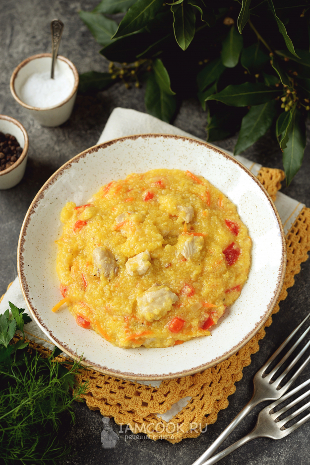 Блюдо получается действительно вкусным. Если любите поленту и мамалыгу, то и кукурузная каша с мясом курицы вам также понравится.