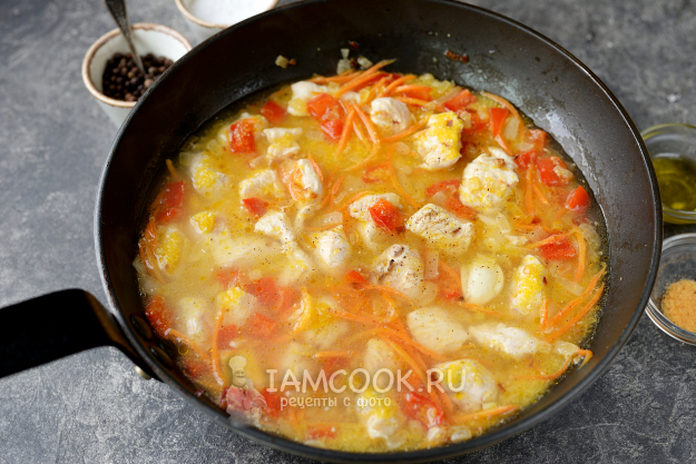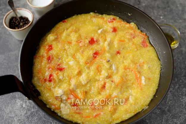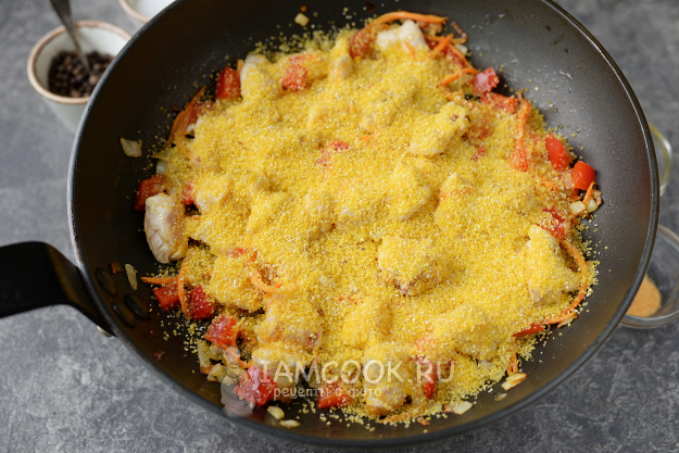 Когда филе полностью побелеет, всыпьте кукурузную крупу, перемешайте.