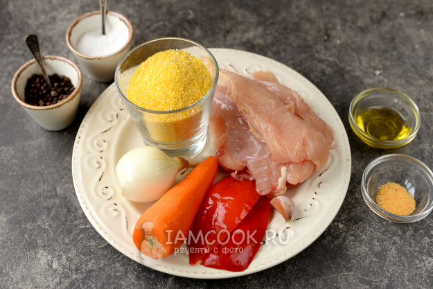 Возьмите все продукты для приготовления кукурузной каши с мясом (курицей) по списку. Лук и морковь почистите, помойте вместе с куриным филе. У меня в морозильной камере нашлось немного болгарского перца, заготовленного с лета, его я также решила добавить в блюдо, не так для вкуса, как для красивого цвета.