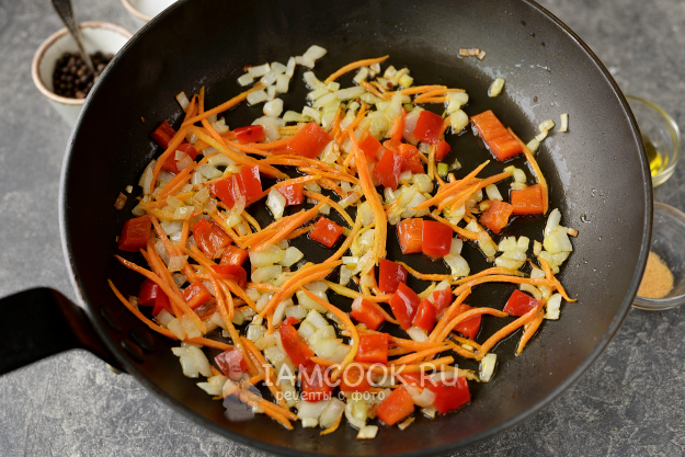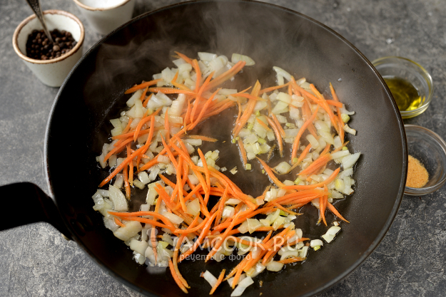 Разогрейте в сковороде немного растительного масла, обжарьте на нем нарезанный мелким кубиком репчатый лук и тонко нашинкованную морковь до мягкости.
