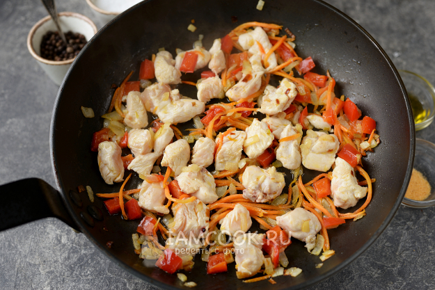 Куриное филе нарежьте кубиком около 2 сантиметров, добавьте в сковороду вместе с чесноком.