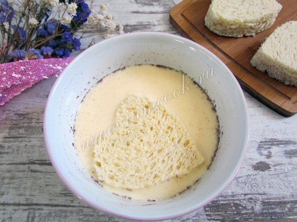 Окуните соединенные ломтики хлеба в яично-молочную смесь на несколько секунд.