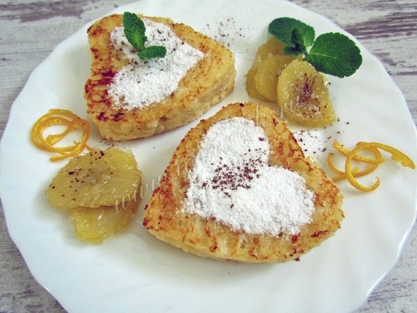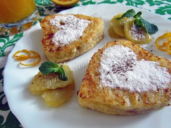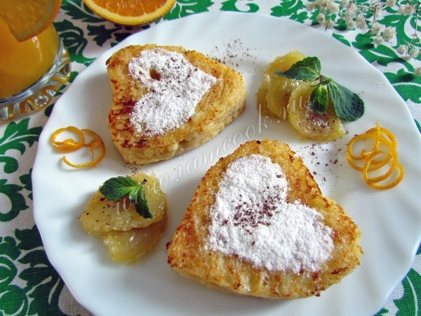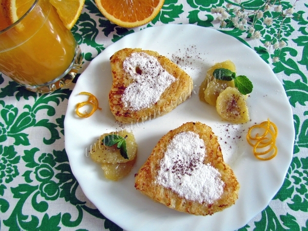 В День всех влюбленных порадуйте свою вторую половину вкусным и сытным завтраком - приготовьте ароматные французские тосты в виде сердца. Подавайте тосты горячими с кофе или свеже-выжатым апельсиновым соком, украсив ягодами или фруктами и листиками свежей мяты. Не забудьте посыпать тосты сахарной пудрой и молотой корицей - очень вкусно.