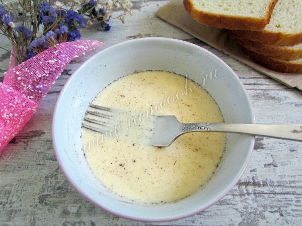 Молоко смешайте с яйцом. Добавьте 1 ст.л. сахара, ванильный сахар и корицу. Взбейте вилкой.