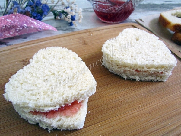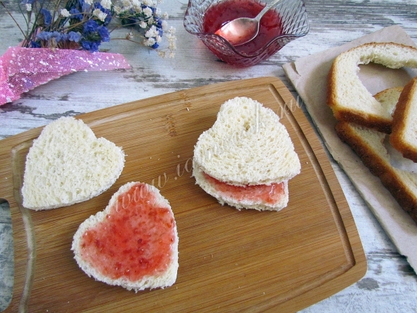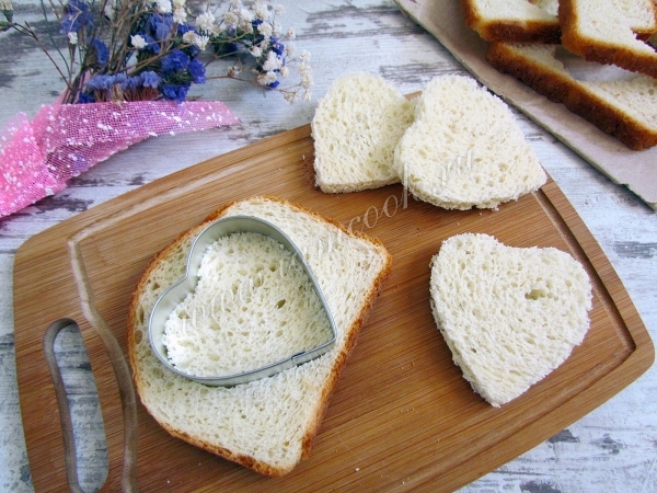 С помощью острого ножа или фигурной формы вырежьте из хлеба 8 штук сердец.