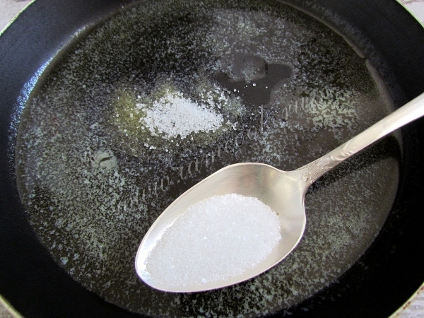 В сковороде на медленном огне растопите 1 ст.л. сливочного масла и добавьте 1 ст.л. сахара (можно тростникового).