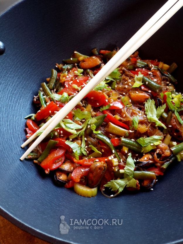 Через секунд 30 убрать с огня. Дать лапше напитаться и можно угощаться - фунчоза с мидиями и овощами готова.