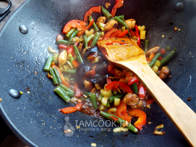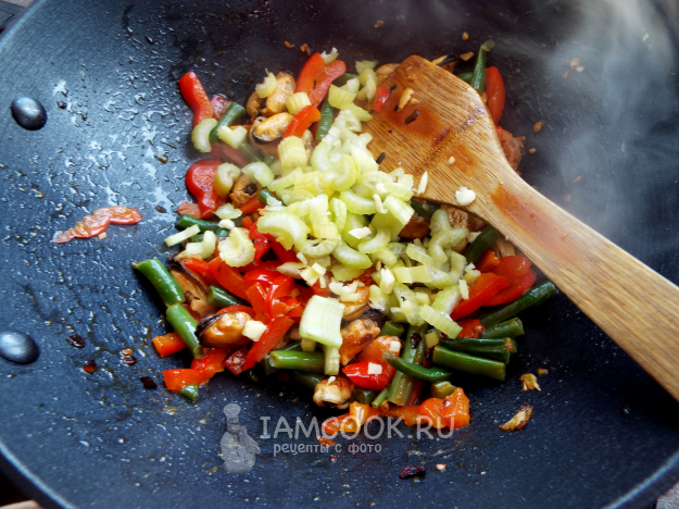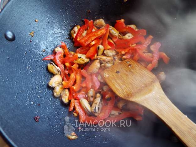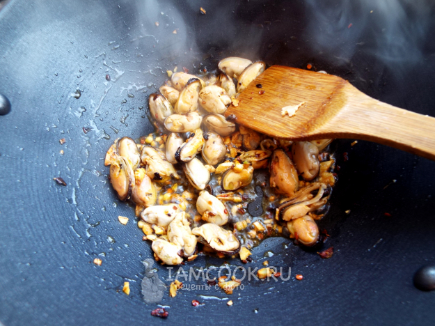 Добавить мидий, жарить примерно минуту.