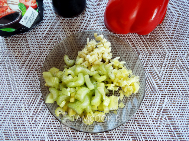 Чеснок, сельдерей и имбирь мелко нарезать.