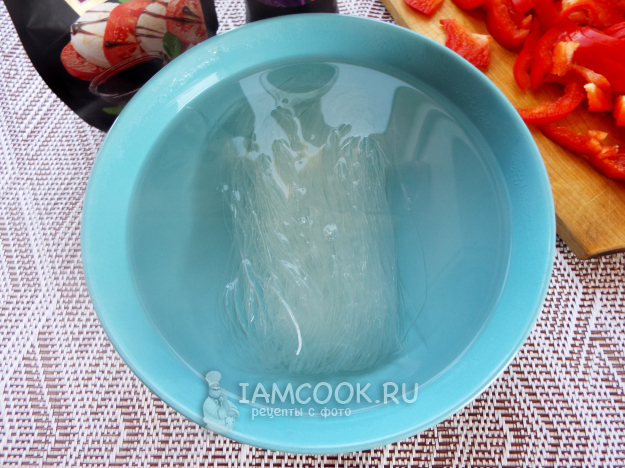 Фунчозу залить кипятком на 5-7 минут. Затем откинуть на дуршлаг.