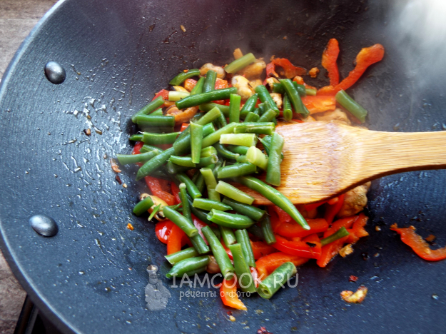 Выложить перец, жарить, помешивая, полминуты.