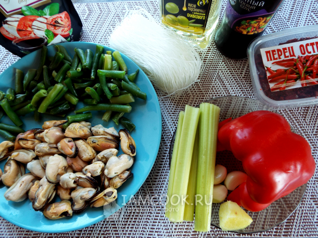 Возьмите продукты для приготовления фунчозы с мидиями по списку.