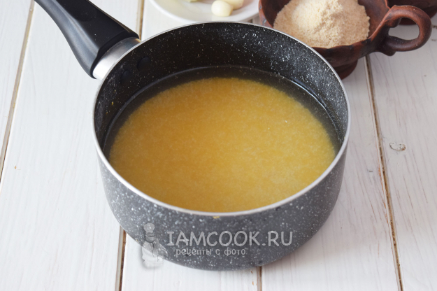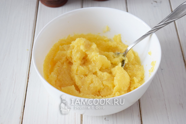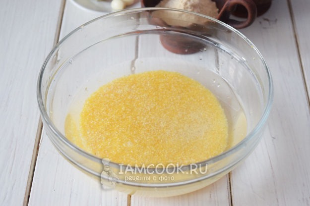 Выложим в сотейник, зальем водой, поставим вариться. С момента закипания будем варить 40 минут на маленьком огне под закрытой крышкой, иногда помешивая ложкой. В итоге у нас должна получиться вязкая кукурузная каша.
