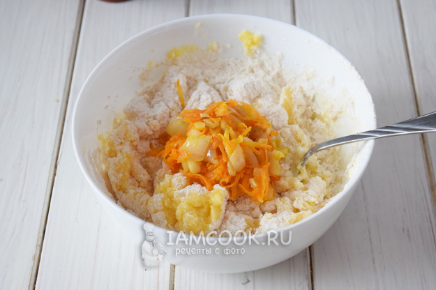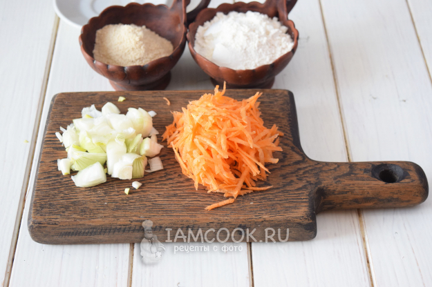 Лук нашинкуем мелкими кубиками. Морковь натрем на крупной терке.