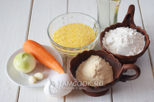 Подготовим ингредиенты для котлет из кукурузной каши. Почистим и помоем луковицу и морковь. Почистим чеснок.