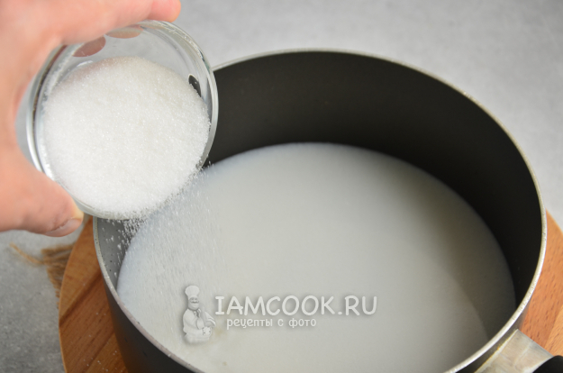 В сотейник влейте кокосовое молоко и воду. Поставьте на огонь, подогрейте и добавьте сахар. Помешайте и ждите пару минут.