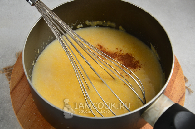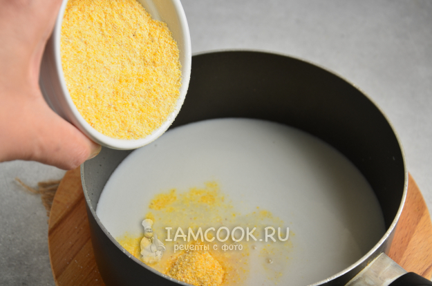 Аккуратно добавляйте кукурузную крупу и на этом же этапе начинайте непрерывно все перемешивать.