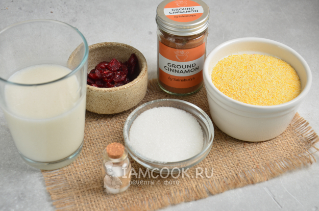 Возьмите все необходимые продукты для приготовления кукурузной каши на кокосовом молоке. Я использую концентрированное кокосовое молоко, оно достаточно жирное и ароматное. Поэтому беру одну часть молока и одну часть воды. Если ваше молоко не концентрированное, можно использовать весь объем, а именно 250 мл.