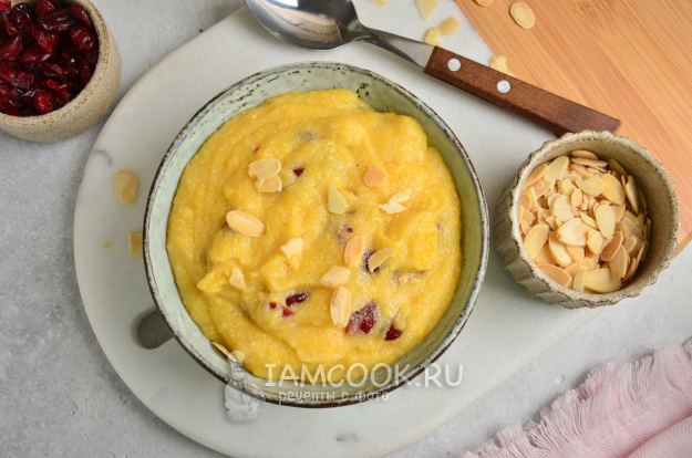 В горячую кашу добавьте вяленую клюкву, перемешайте и переложите в тарелку. Перед самой подачей присыпьте миндальными лепестками.