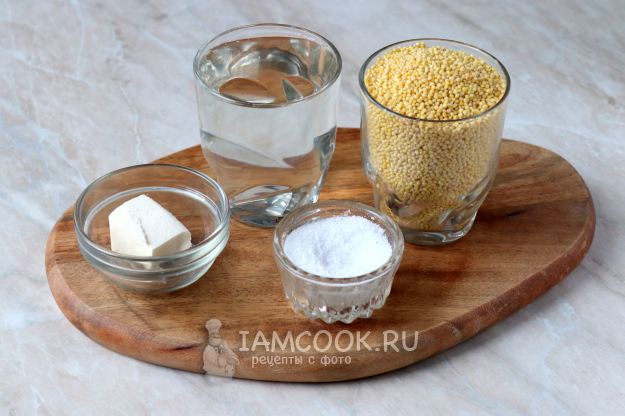 Возьмите все необходимые продукты для приготовления пшенной каши без горечи по списку к рецепту.
