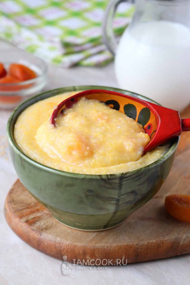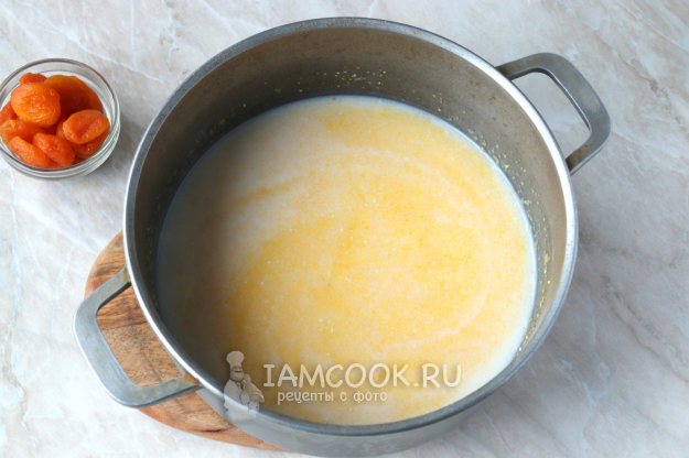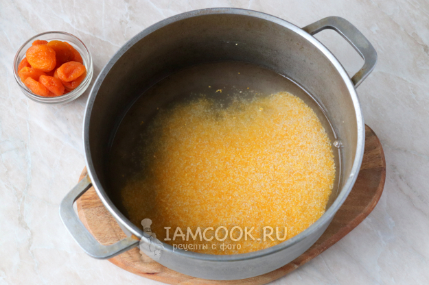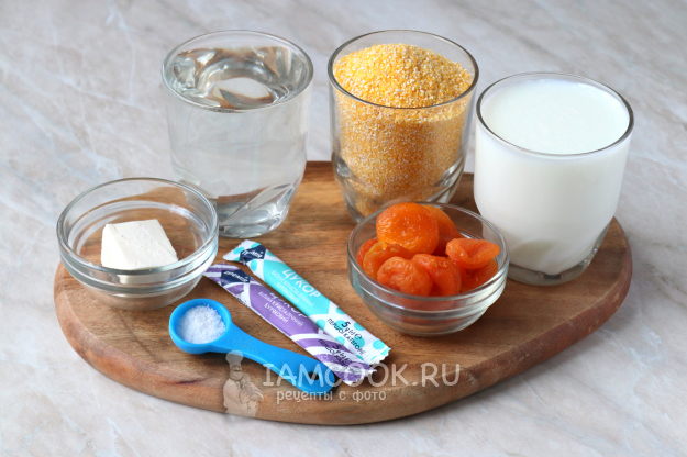 Чтобы сварить кукурузную кашу с сухофруктами (курагой), потребуются следующие ингредиенты.