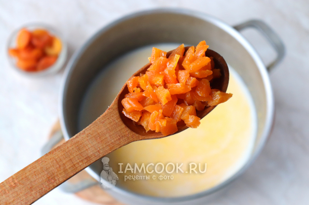 Тем временем подготовим курагу. Промоем её, обсушим и нарежем небольшими кубиками. Добавим сухофрукты в кашу за 5 минут до её готовности.
