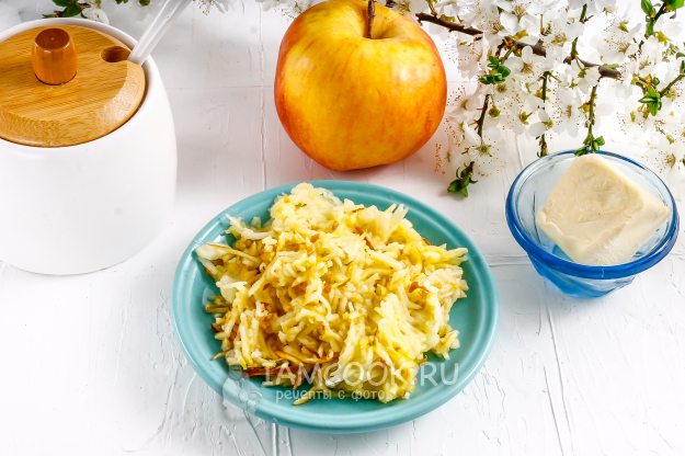 В это время очистите яблоки от кожуры, промойте в воде и натрите на терке с мелкими ячейками.
