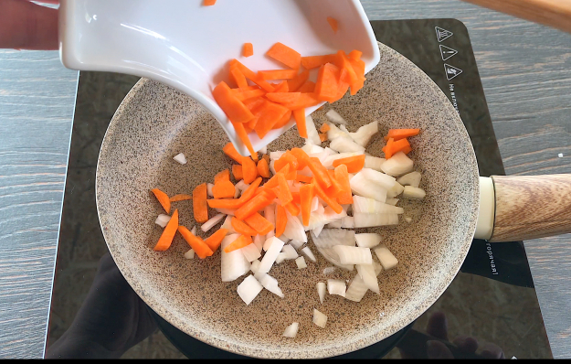 Нарежьте лук и морковь на маленькие кусочки, затем обжарьте на растительном или сливочном масле до мягкости.