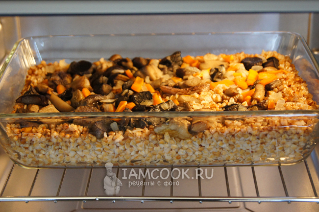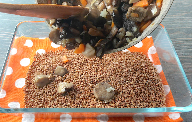 В жаропрочную форму всыпьте гречневую крупу (если необходимо, промойте). Сверху выложите обжаренные грибы с овощами.