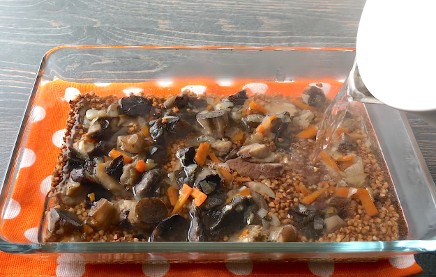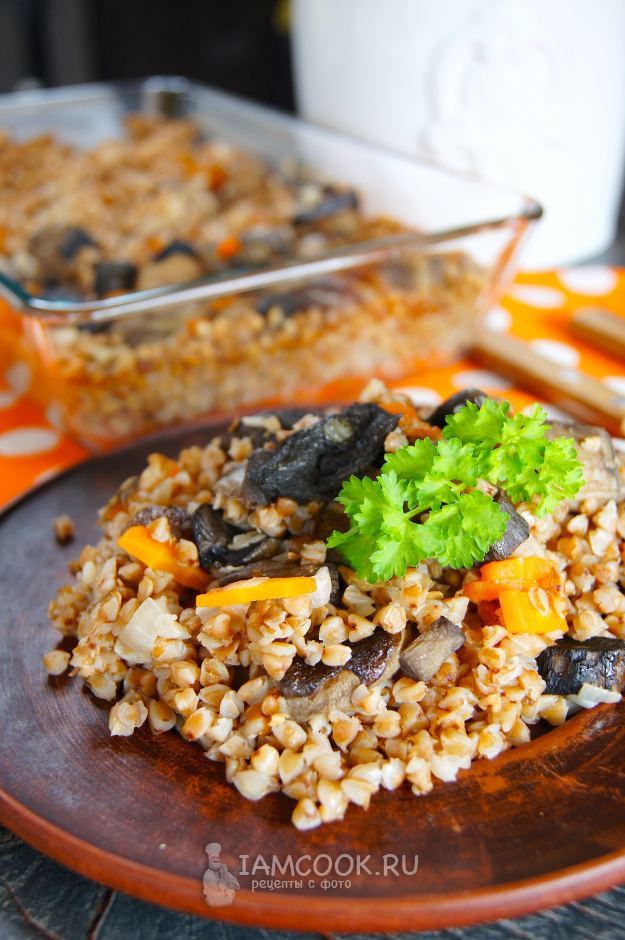 Залейте крутым кипятком, накройте фольгой и поставьте гречку с грибами в духовку, разогретую до 180-190 градусов, на 35-40 минут.