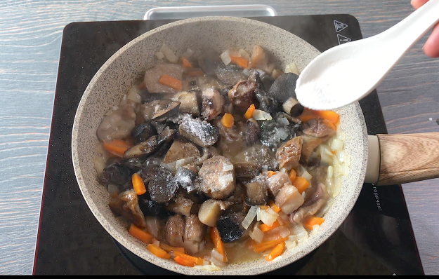 Далее выложите грибы, посолите и обжарьте, помешивая, около 15 минут.