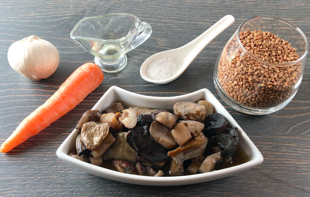 Первым делом подготовьте все необходимые продукты для приготовления гречки с грибами в духовке.