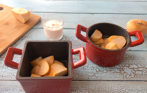 Выложила в горшочки кусочки репы и мелко нарезанный чеснок.