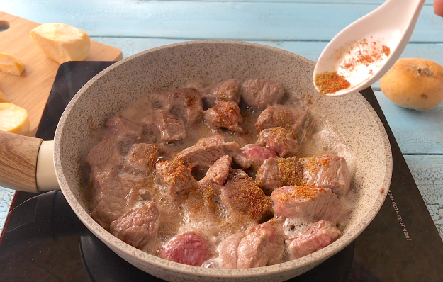 Разогрела сковороду и обжарила мясо на среднем огне до появления мясного сока. Посыпала солью и специями для мяса.