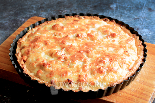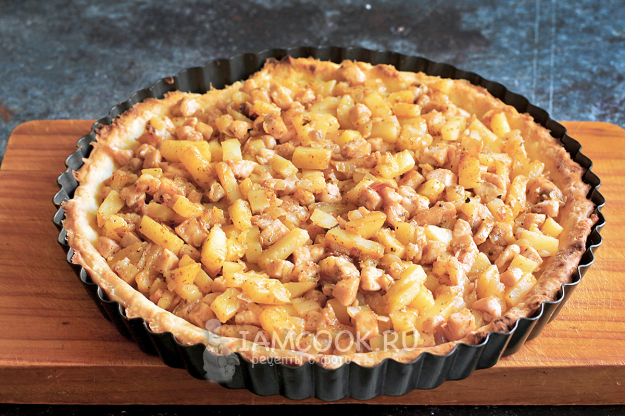 Достаньте киш с курицей и картошкой из духовки и дайте ему немного остыть. Затем освободите от формы.