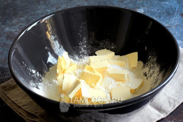 В муку добавьте соль и сахар, перемешайте. Затем натрите на терке или нарежьте кубиками холодное сливочное масло.