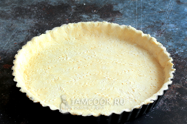Затем переверните пакет с тестом на форму для выпечки, которую смазывать ничем не нужно. Аккуратно отлепите пакет от теста, а его распределите равномерно по всей форме, остатки теста срежьте ножом. Наколите поверхность вилкой и поставьте в разогретую до 190 градусов духовку на 10-15 минут. Нужно чтобы корж зарумянился и хорошенько пропекся.