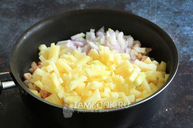 Затем добавьте картофель и репчатый лук. Обжарьте все вместе на малом огне до мягкости картофеля. Доведите начинку до вкуса, приправив ее специями и солью, остудите.