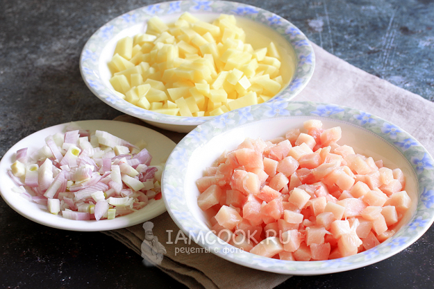 Куриную грудку разморозьте и нарежьте мелким кубиком. Точно так же нарежьте очищенный картофель. Лук репчатый лучше всего нарезать не квадратами, а тонкой соломкой.