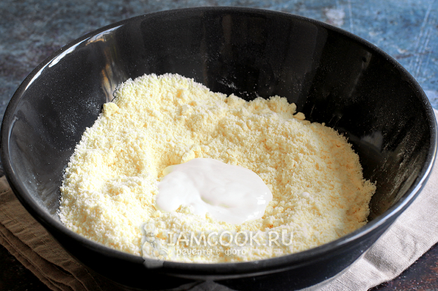 Хорошенько перетрите масло с мукой в мелкую крошку. Добавьте сметану и начните смешивать тесто. Если необходимо, то влейте еще пару ложек ледяной воды.