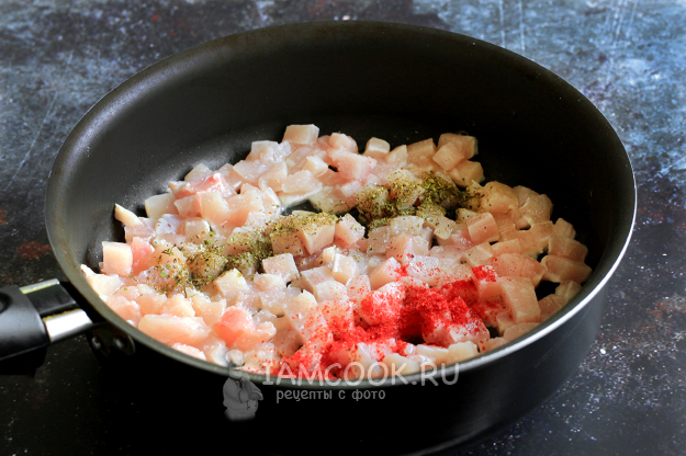 В сковороде разогрейте растительное масло. Обжарьте куриное филе до побеления. Посолите, добавьте паприку и черный перец по вкусу. Перец можно заменить молотым кориандром или специями, которые вы любите.