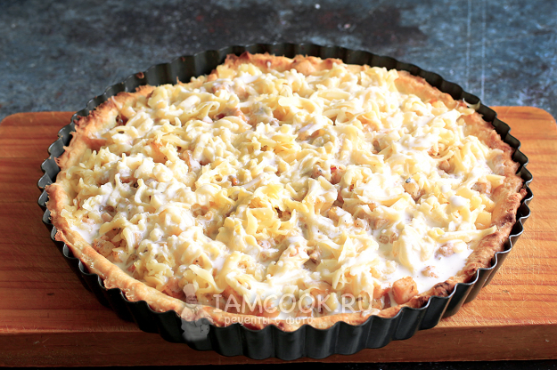 Посыпьте тертым сыром и залейте заливкой. Выпекайте киш с курицей и картофелем в горячей духовке еще 15-20 минут. Время выпечки зависит от вашей техники. Как только поверхность хорошенько зарумянится - пирог готов.