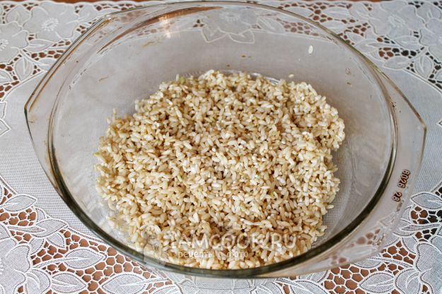 Затем воду нужно слить, а крупу удобнее поместить в такую посуду, чтобы можно было и на плиту поставить, и в духовку отправить. Я взяла кастрюлю для СВЧ. Если у вас нет такой посуды, то используйте обыкновенный сотейник или кастрюлю для варки, а потом переложите кашу в форму для запекания.