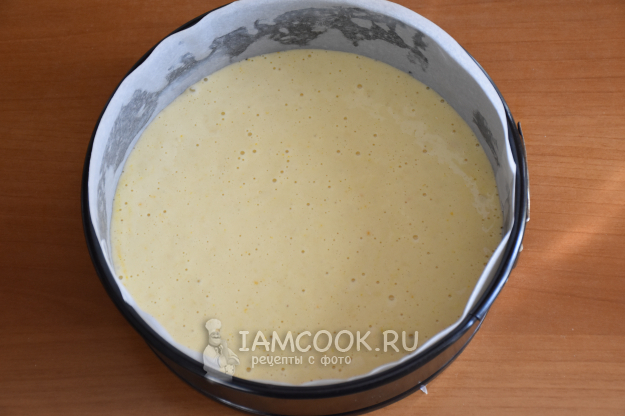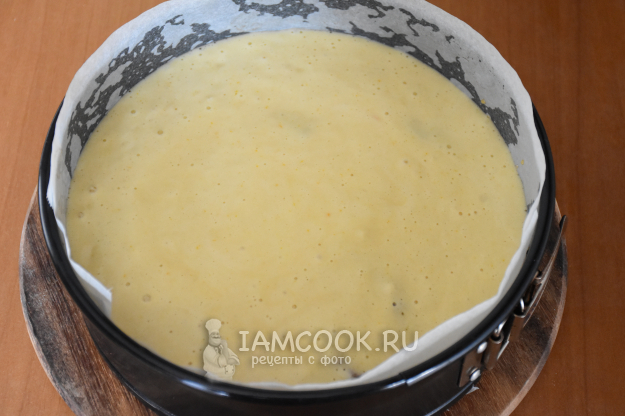 В форму диаметром 20 см с пергаментом выложить половину теста и разровнять.