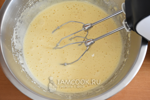 Яйца взбить с сахаром до получения пышной светлой массы.
