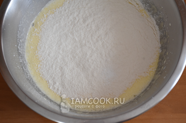 Пшеничную муку перемешать с разрыхлителем и просеять в тесто. Аккуратно перемешать.
