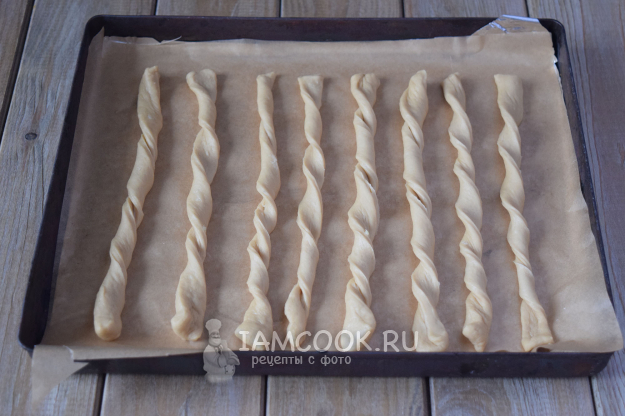 Противень застелем пищевым пергаментом и будем выкладывать на него полоски теста, скрученные в виде спиралек. Выпекать будем в духовке, заранее разогретой до 180 градусов, 12-15 минут.