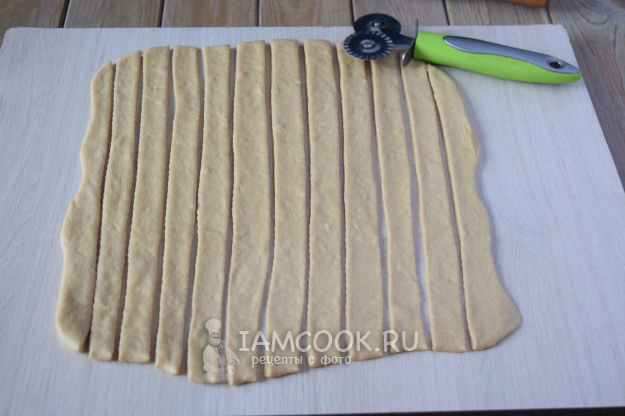 Условно всё тесто поделим на 3 части и каждую будем раскатывать в пласт толщиной в 1-2 мм. Пласт нарезаем на полосы шириной 1-1,5 см.